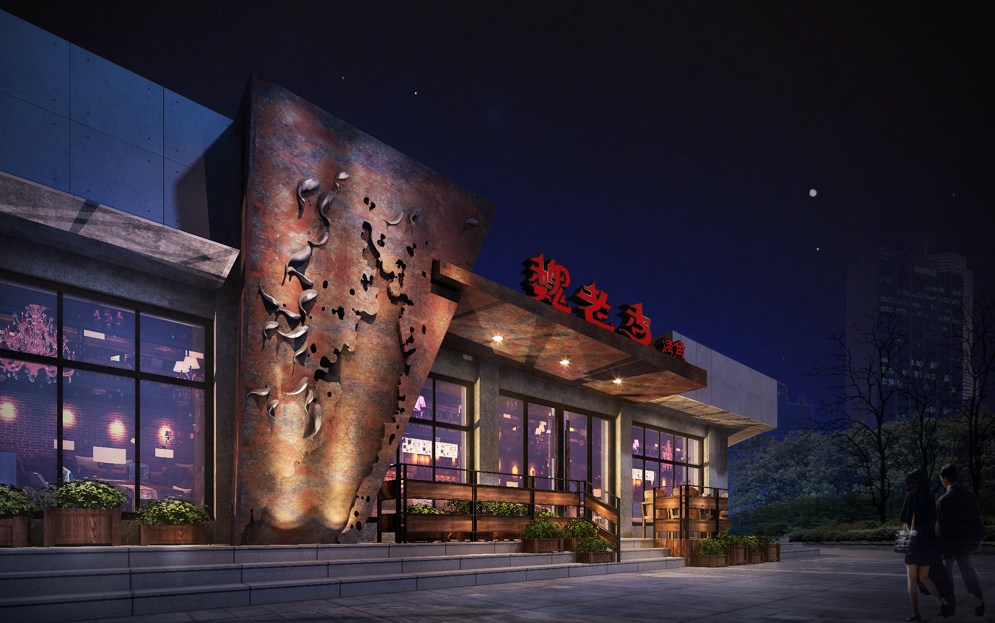 門頭,不規則幾何體銹鐵造型,搭配海浪和魚元素,與室內遙相呼應,貫穿始終,詮釋了烤魚店的主題。
